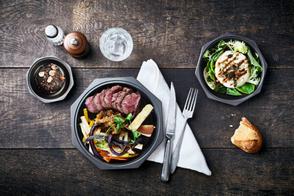 Cœur de rumsteck et foie gras poêlé, légumes racines rôtis au sirop d’érable, confit d’oignon