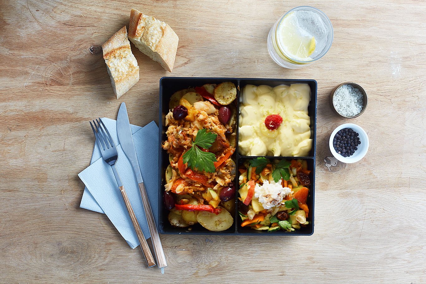 Émietté de merlu à la basquaise, grenailles rôties à l’origan