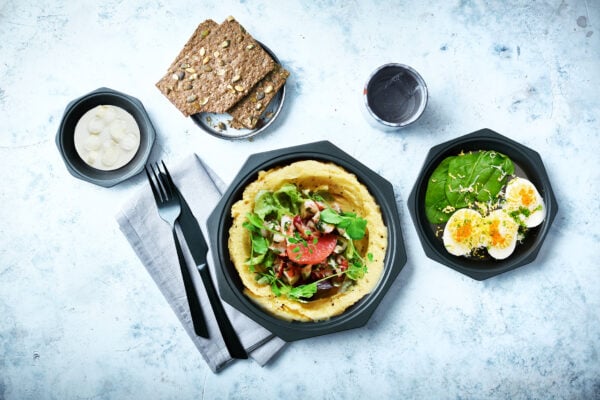 Houmous à l’ail confit, légumes grillés à l’huile de thym et éclats de châtaigne
