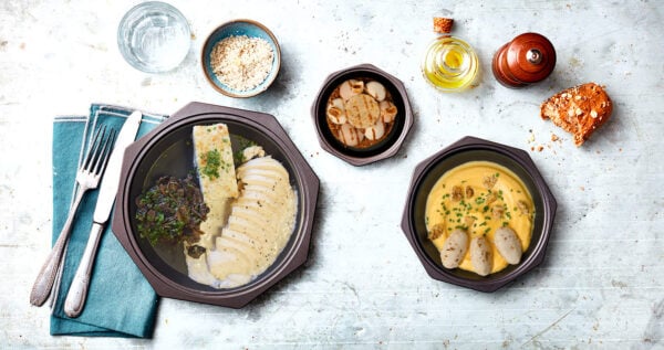 Filet de poulet à la normande, gratin dauphinois et champignons sautés