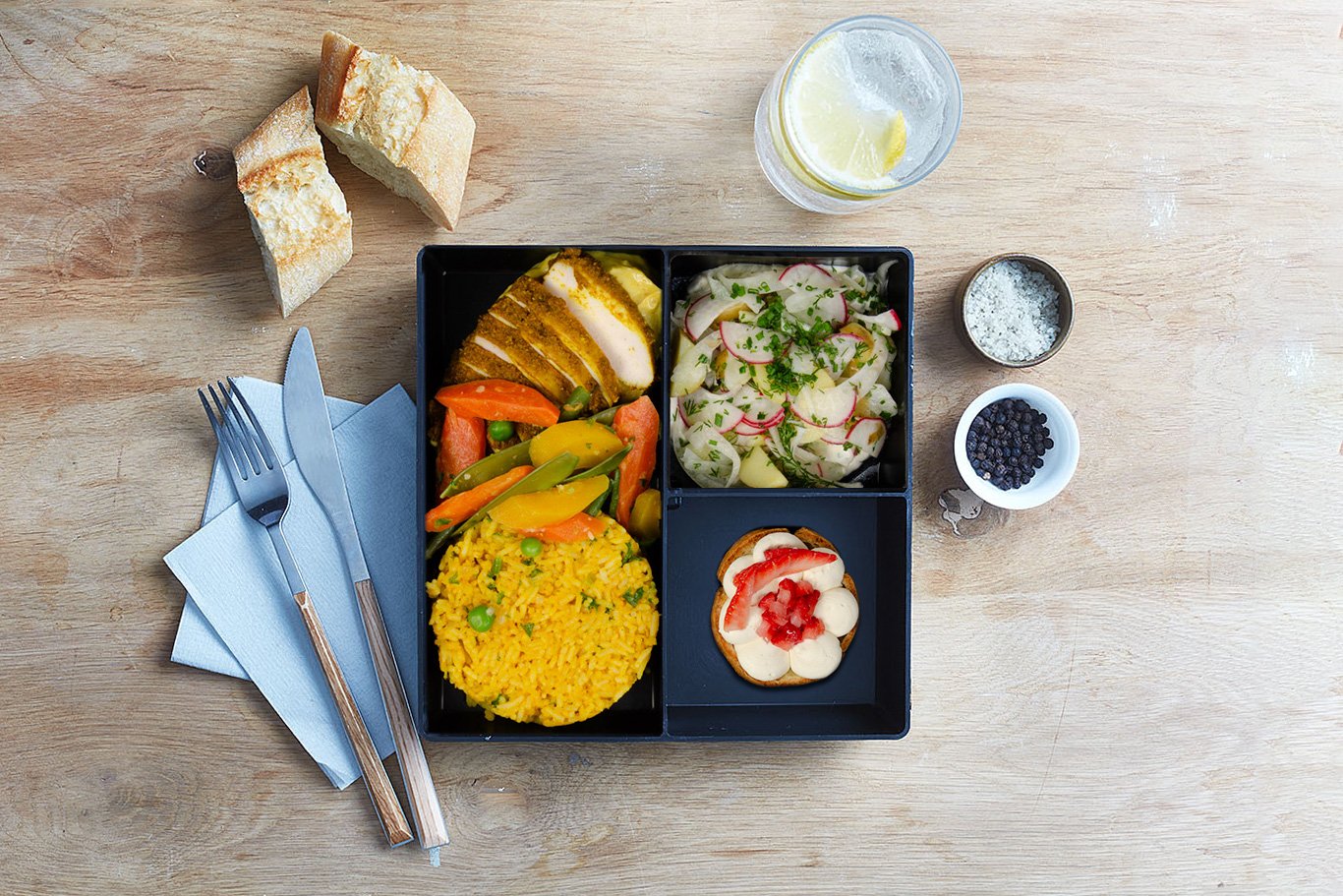 Boulettes de poulet, sauce au poivre, panais et carottes rôtis au four, riz pilaf