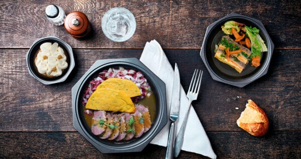 Cœur de rumsteck et foie gras poêlé, légumes racines rôtis au sirop d’érable, confit d’oignon