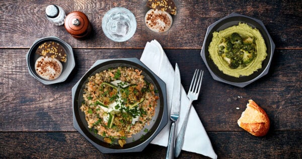 Gravlax de truite, guacamole de petits pois, et orge mondée aux tomates séchées et mange tout